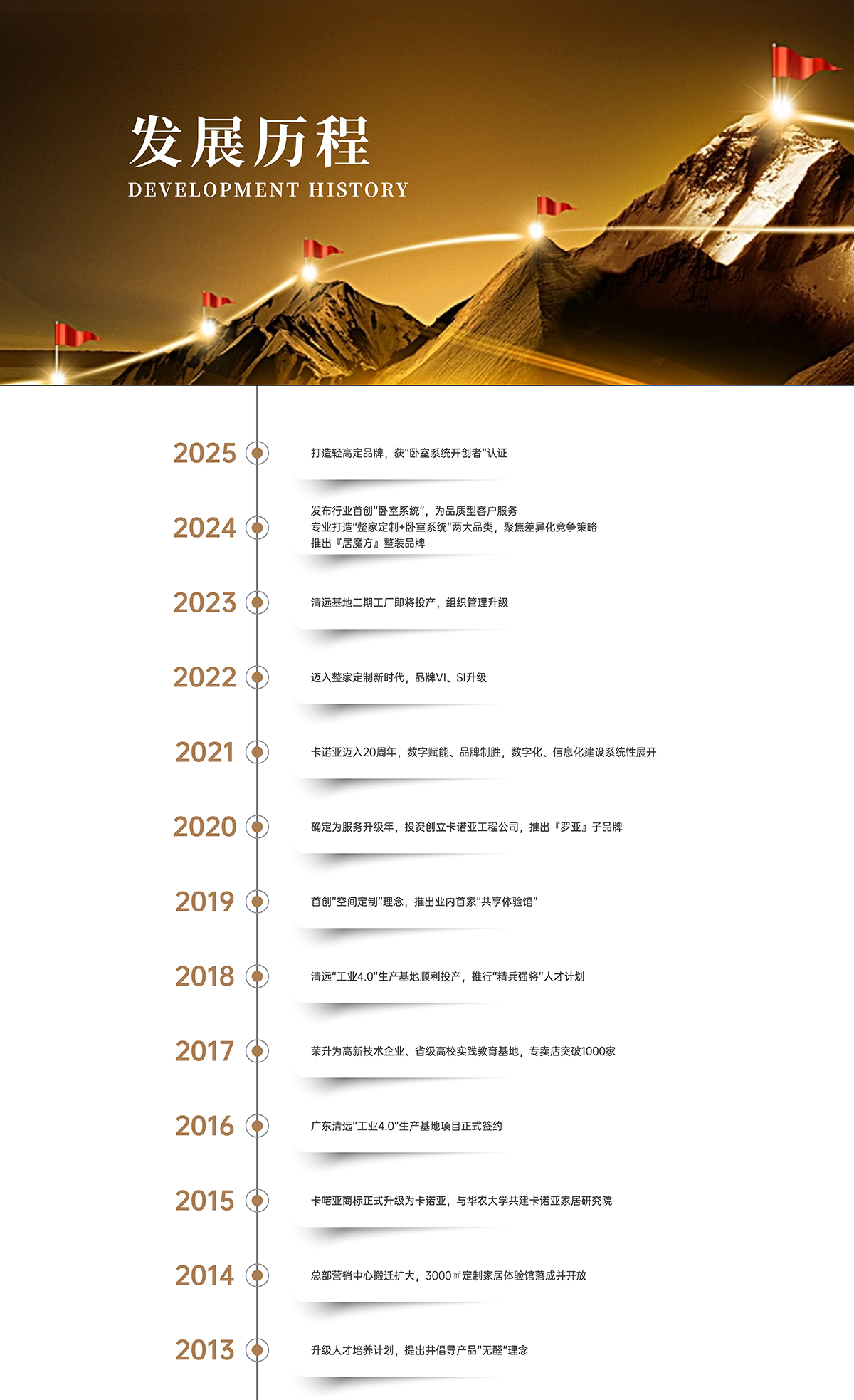 卡諾亞創立于2001年,是集研發、設計、生產和服務于一體的高新技術企業。旗下擁有居魔方整裝、卡諾亞高端定制、羅亞全屋定制三大品牌。