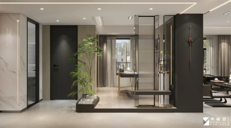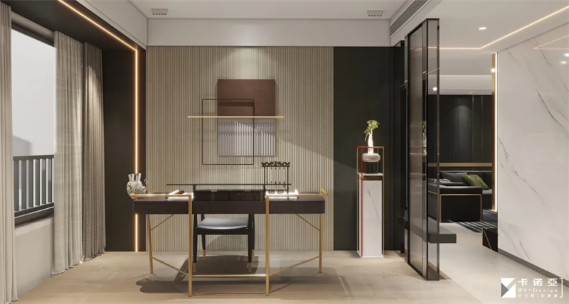 開放式書法室,以淡雅、寧靜色調(diào)為主,深色點(diǎn)綴,營造靜謐、專注的氛圍。材質(zhì)上,選用格柵板、金屬、玻璃、大理石等跨界混搭,綠植點(diǎn)綴,既符合書法的自然氣息,又能提升室內(nèi)的輕奢質(zhì)感。