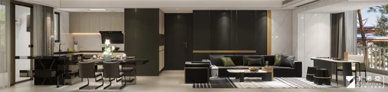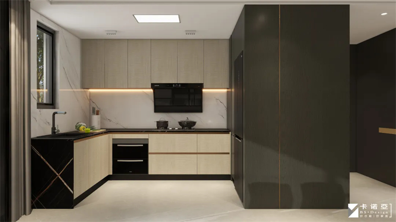 ③廚房采用高級黑+白撞色設(shè)計(jì),溫馨木色減緩空間冷感