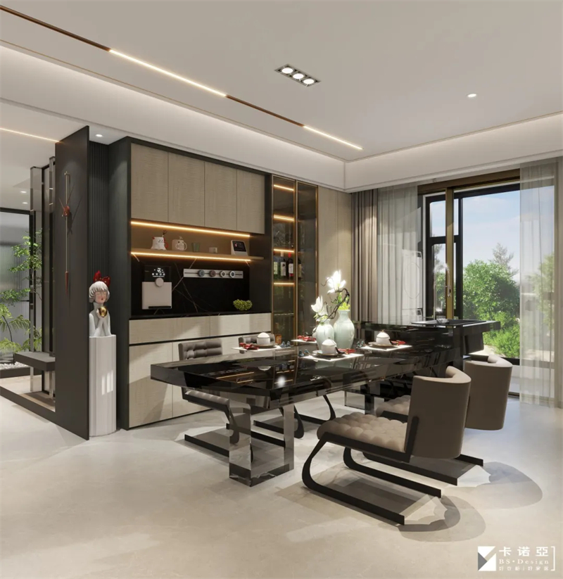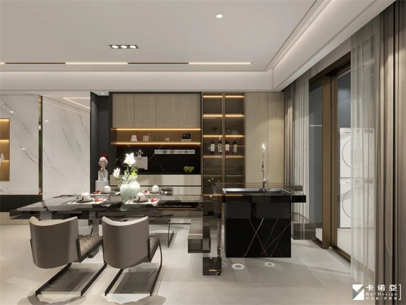 靠近餐桌的地方設(shè)置了餐酒柜,色彩與全屋呼應(yīng),茶色玻璃柜門通透可見,可以收藏香檳與紅酒、杯具,觥籌交錯,微醺生活,是E人聚會轟趴的好地方。