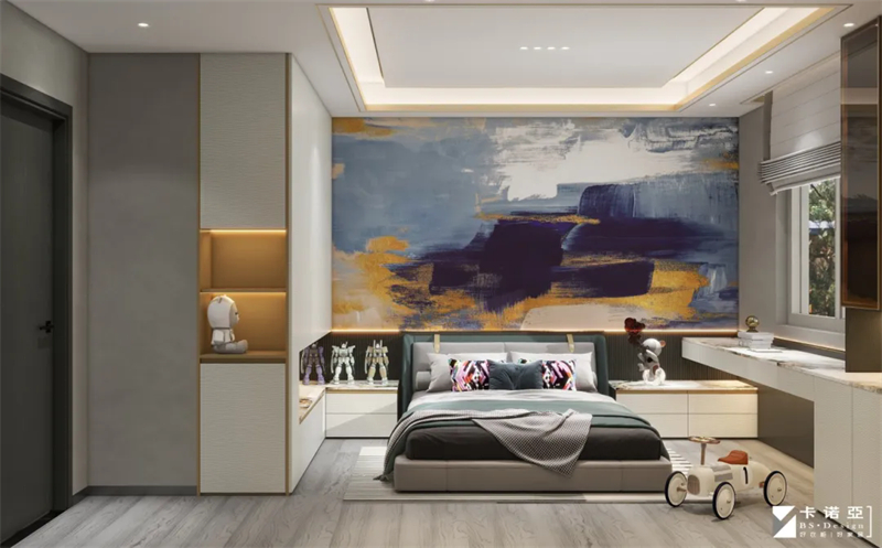 懸浮頂+燈帶吊頂設(shè)計(jì),除了輔助照明外,還能讓空間凸顯溫馨氛圍和層次美。床頭柜與衣柜及書桌一體化設(shè)計(jì),不占地兒更整體。