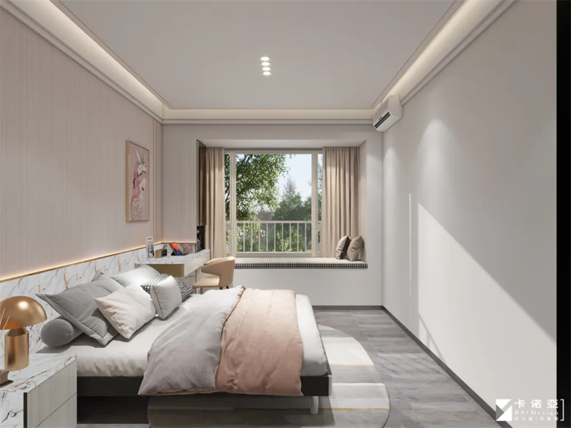 床頭處打造學(xué)習(xí)區(qū),床頭柜做成懸浮式書桌,與飄窗柜一體化設(shè)計(jì),開放格妥帖安置書本,安靜獨(dú)立學(xué)習(xí)區(qū)讓孩子一眼就心動~