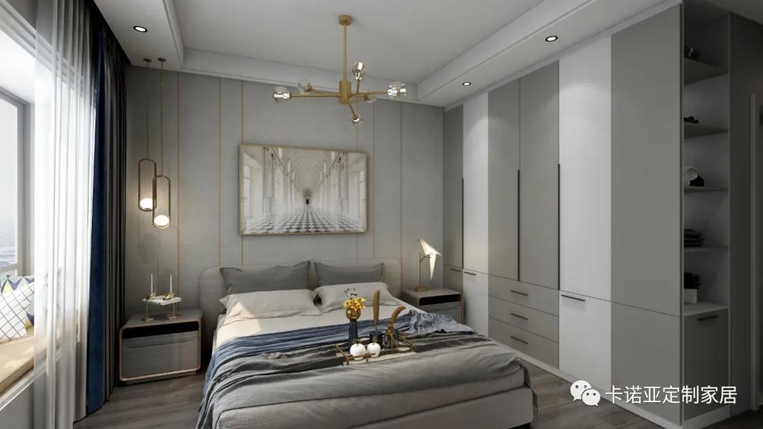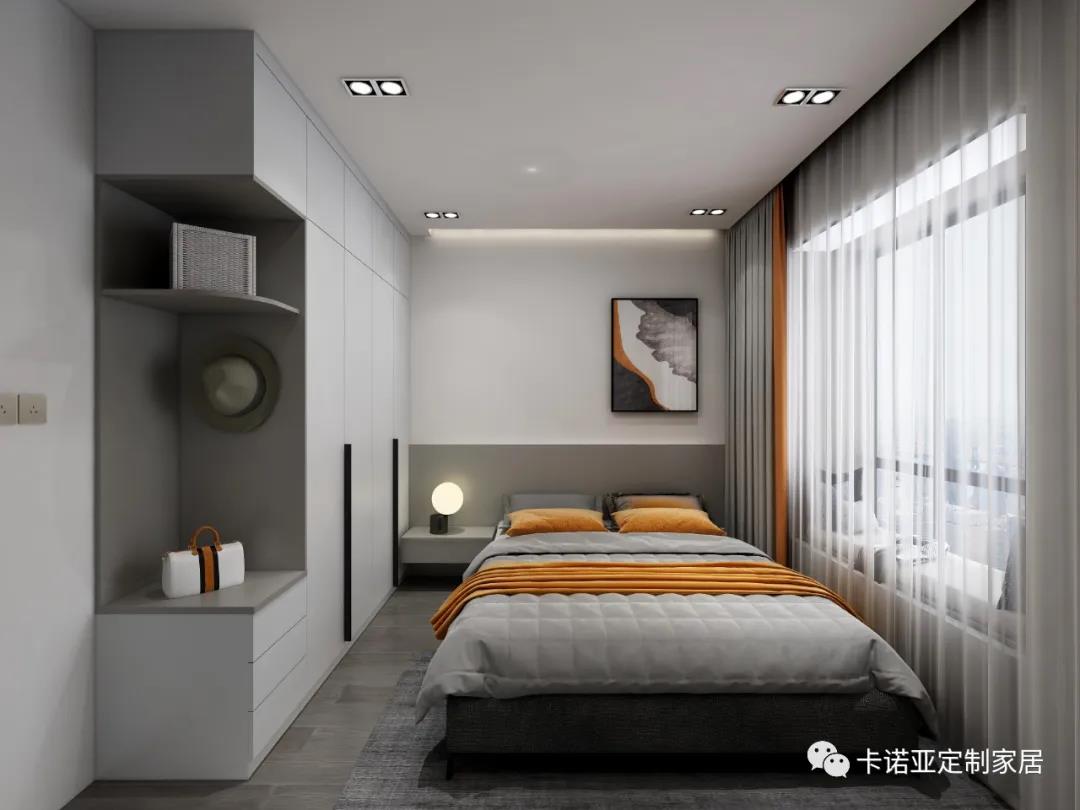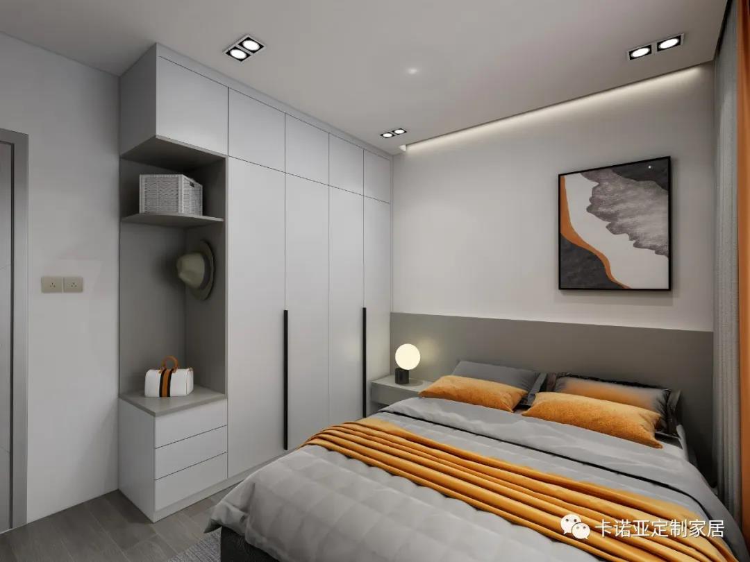 從干凈簡(jiǎn)潔的主臥可以看出業(yè)主家居生活的審美與需求一柜到頂?shù)腖形雙拼色衣柜搭配長(zhǎng)拉手,簡(jiǎn)潔又實(shí)用還讓臥室在視覺和實(shí)際感官上都更為開敞