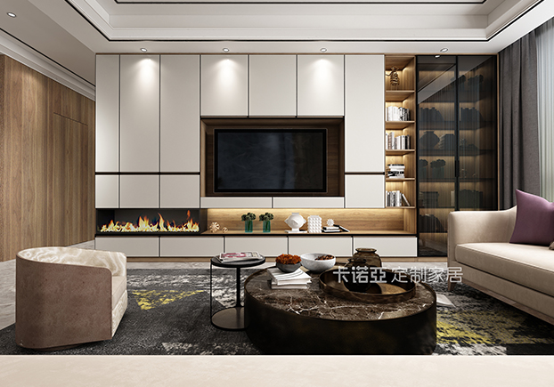 電視柜半開放設(shè)計(jì),黑框金屬玻璃門的搭配使得整個(gè)空間更富有立體感。