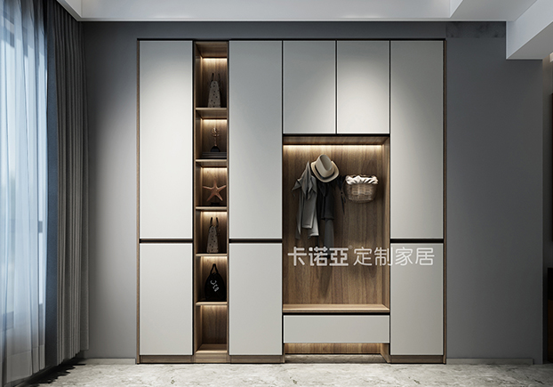 嵌入式玄關(guān)柜,下面是用木質(zhì)板做成的換鞋凳,上面再設(shè)計(jì)掛鉤,這樣實(shí)用功能和裝飾作用都大大增強(qiáng)。