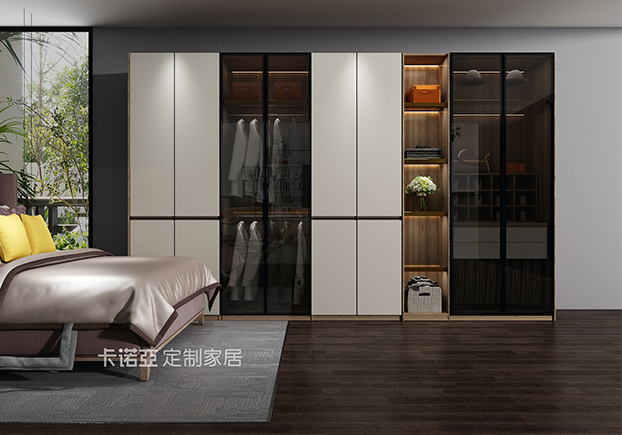 臥室比較沉穩(wěn)大氣,玻璃門半開放式衣柜黑白相間,空間空曠開放,有點(diǎn)極簡風(fēng)。