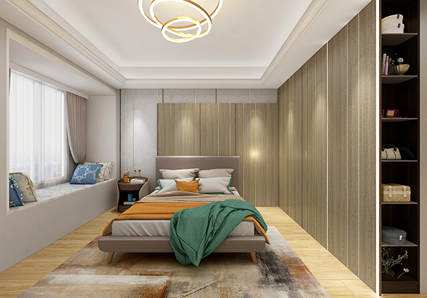 暖色調為主的臥房,走近便讓人有了睡意,窗簾配色也與墻面配色遙相呼應,一個合適的飄窗,剛好用來打發周末的閑暇時光,看本書或者倚靠著打個盹也不錯。