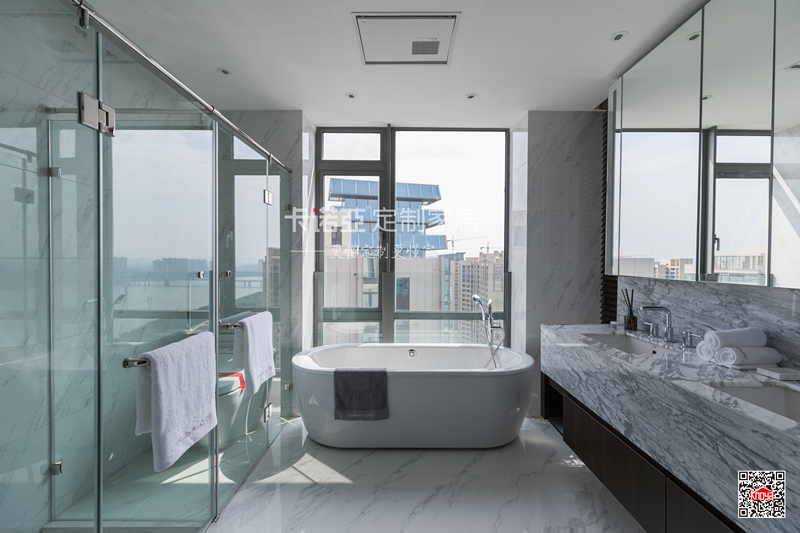 深色浴室柜體點(diǎn)睛,加上大面積玻璃的使用,衛(wèi)生間大氣明亮,空間通透開(kāi)闊。