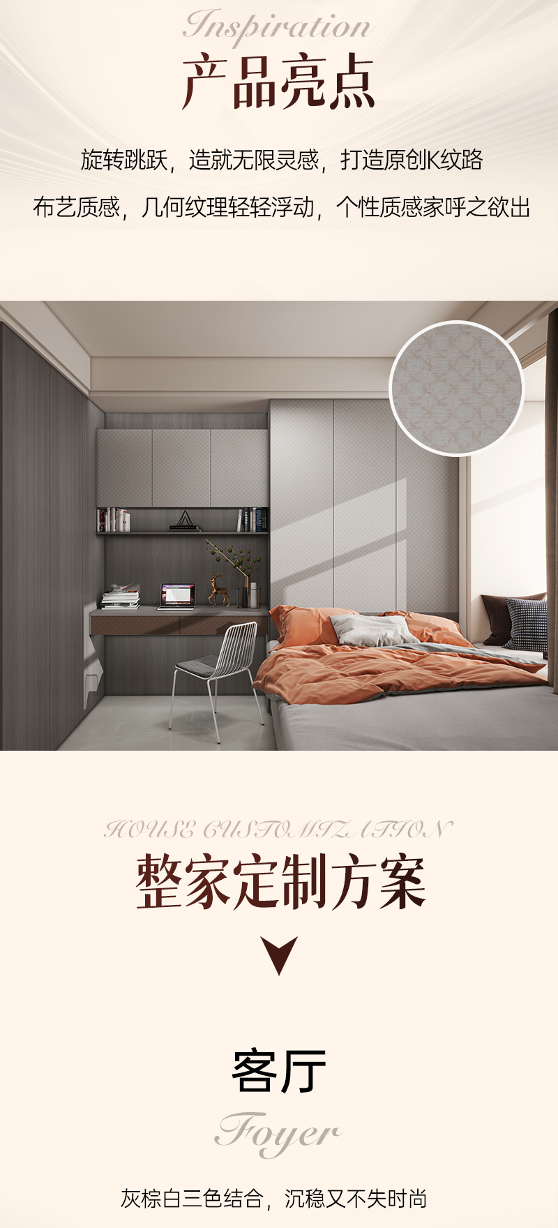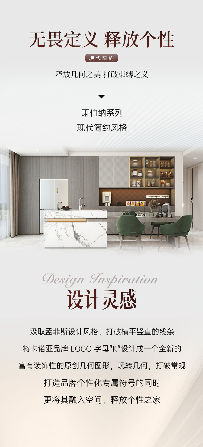 汲取孟菲斯設計風格,打破橫平豎直的線條,將卡諾亞品牌 LOGO 字母"K"設計成一個全新的富有裝飾性的原創幾何圖形,玩轉幾何,打破常規,打造品牌個性化專屬符號的同時,更將其融入空間,釋放個性之家。