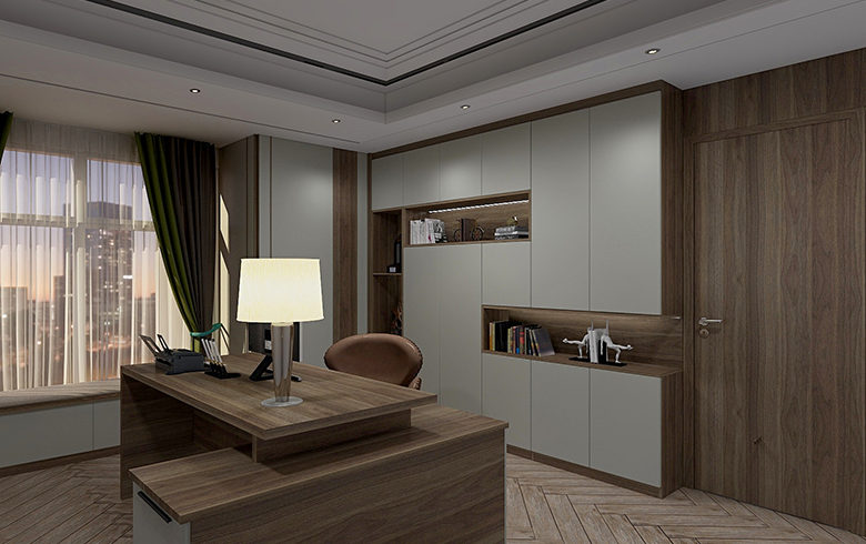護(hù)墻系統(tǒng)采用御品木+紳士灰的創(chuàng)意混搭,配合柔和燈光,營(yíng)造靜謐舒適的書房環(huán)境,專利扣線與板材花色保持統(tǒng)一無(wú)色差,且很好地包梁包柱,極大地增添了整體空間的統(tǒng)一感。