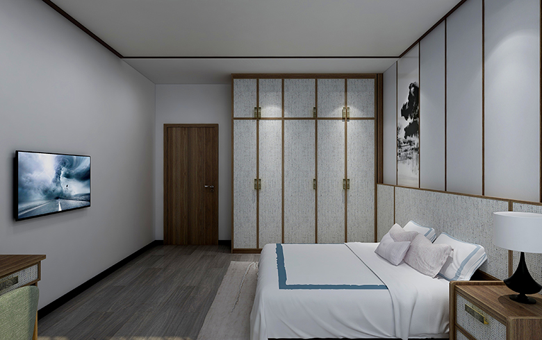 護(hù)墻系統(tǒng)由簡(jiǎn)潔大方的印象白與御品木拼接而成,加上山歌墨舞等中式元素的運(yùn)用,將整個(gè)新中式臥房空間點(diǎn)綴的莊重而優(yōu)雅。
