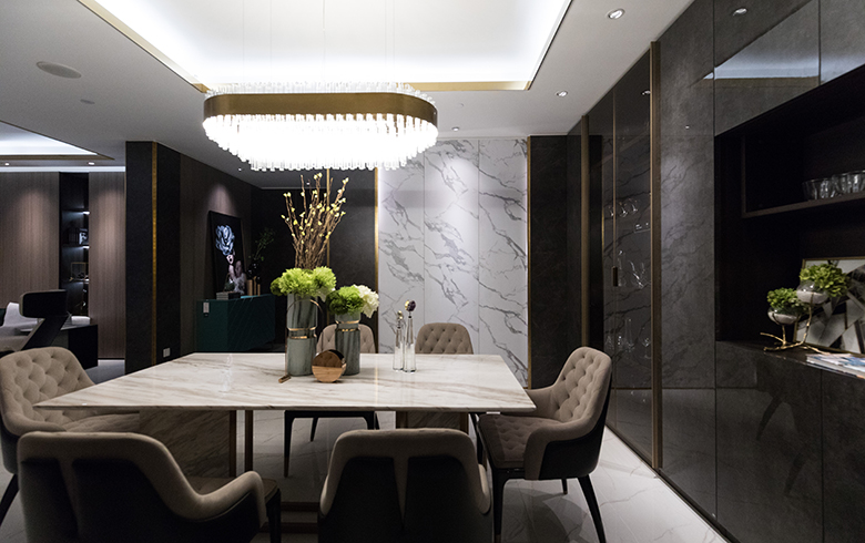 餐廳護墻板采用漢白玉搭配黑鉆灰,對比鮮明,視覺沖擊力震撼,中間采用黃銅金屬線條拼接,輕奢風撲面而來。