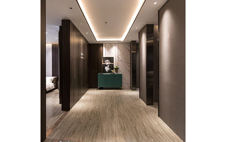 護墻系統(tǒng)采用漢白玉及深木色混搭的護墻板,漢白玉的簡潔明快,搭配不失溫情的木色,中間扣線的簡單切割拼接,統(tǒng)一中有變化,低調中帶點小清新,制造出時尚輕奢的生活美學。