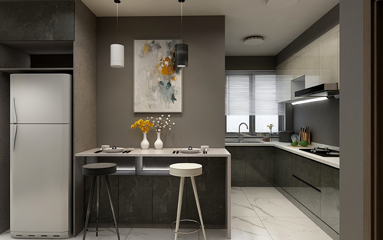 以黑白灰為主體色,的極簡風格家居設計,配上一部分深色木紋,緩和空間色調。凸顯出簡約而不簡單的現代簡約風格設計。