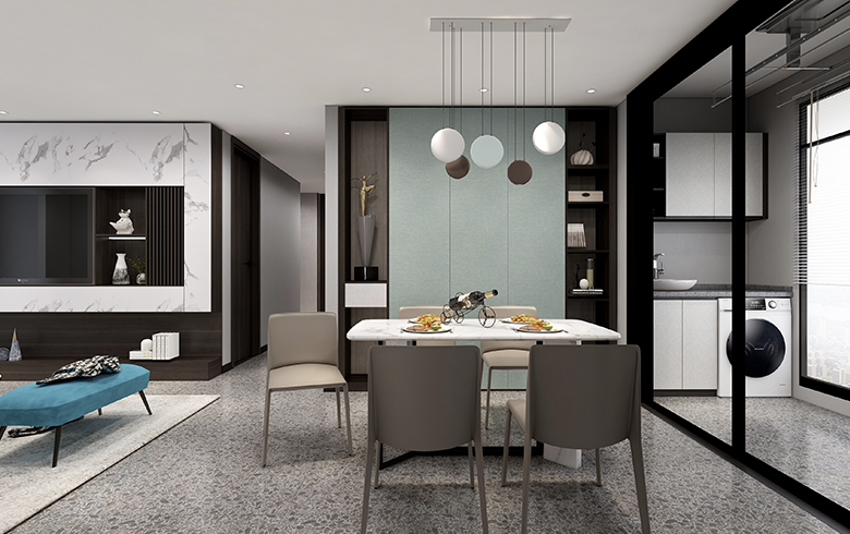 該方案為極簡系列,現代風格。本方案設計靈感來源于鴉頭棕雀的鳥巢,整體空間以木紋色為主,采用淡藍色為輔助色作為點綴。空間戶型面積約為103m2,大致分為客餐廳、陽臺、廚房、衛生間、主臥、次臥以及書房。動靜分區,互不干擾。整個客餐廳色調有淺灰、黑色兩個色調,視覺上顯得統一。廚房設計為L型。主臥床頭背景設計兩層,第一層與柜體顏色相呼應;第二層與柜門顏色呼應。顏色統一,層次與立體感強;通過橙色調進行點綴,增加空間的靈動性。次臥的主色調是淺灰色,是深受現代主流的配色,給人一種親近的感覺。書房背景以淺色與護墻的顏色統一,但橙色最為點綴,不會顯得單調沉悶。