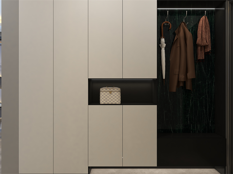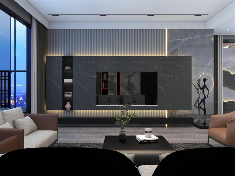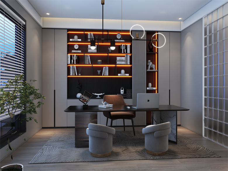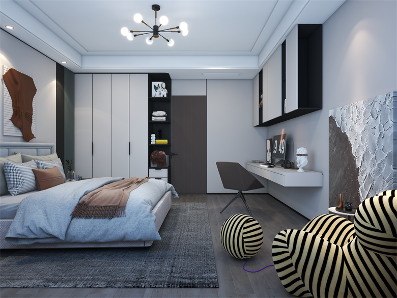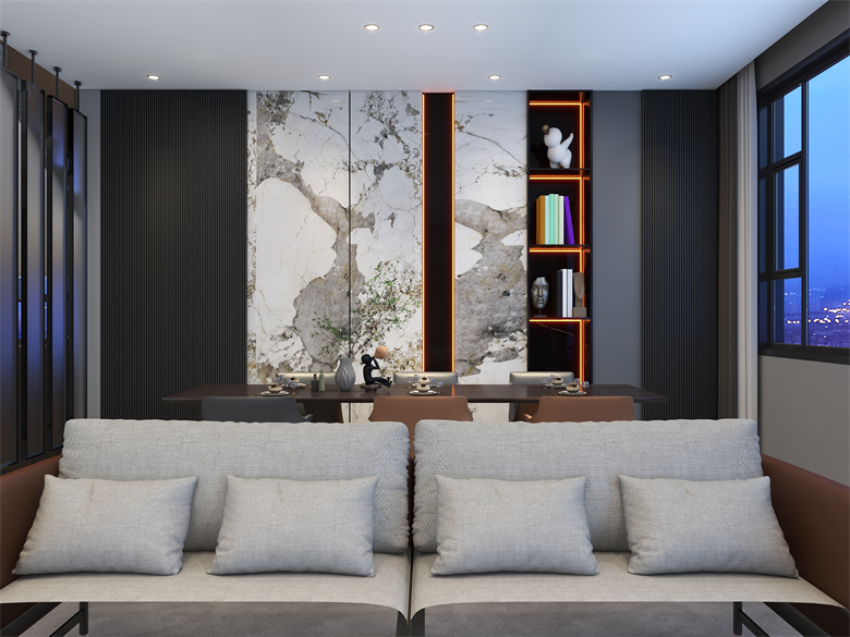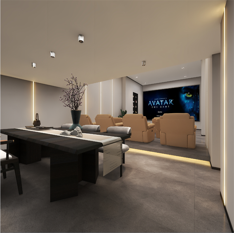 此案,為現代極簡風格,整體以簡單大氣,穩重不失溫馨,設計上嚴格遵循人體工程學原則,在造型、材質等方面要符合人的生理和心理需求。此案設計的色彩比較單一,顏色多選用單色,或少數幾種顏色搭配。避免使用多種顏色混搭以及避免使用強烈對比的顏色,復雜華麗的顏色,反對繁瑣的花紋色彩的搭配。在色彩上追求平和、舒緩、內斂之感極簡主義的設計多采用直線、方形,或規則簡單的幾何形狀,減去一切不必要的元素與細節,比例精確,整體呈現簡潔明快,干凈利落感覺。此案中大部分空間運用了無主燈,因為無主燈設計講究的是“見光不見燈,分區域散點照明”。而且的無主燈設計能夠讓空間更具層次感,顯得非常的高級,若隱若現,層次分明。