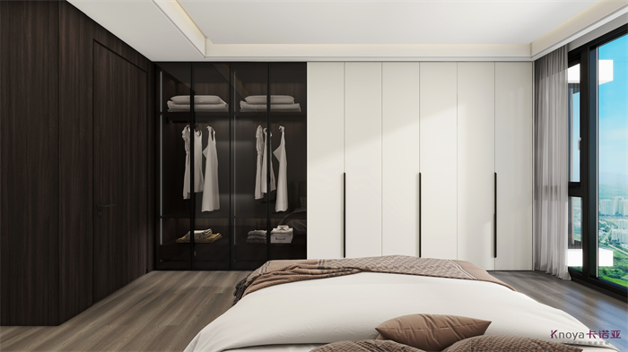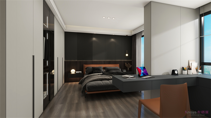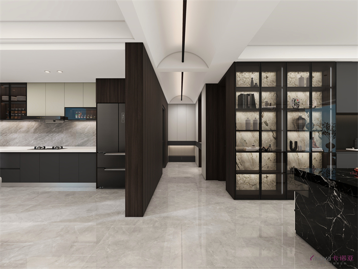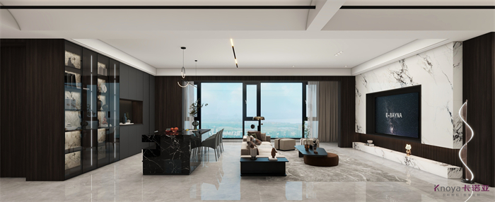 設計方案是一個意式簡約風的大平層,門板材料主要是以水性漆為主,客廳空間因為改造后跨度比較大,光線比較好,所以我們采用部分深色的墻面來搭配淺灰色的地板,讓空間大氣不失沉穩。