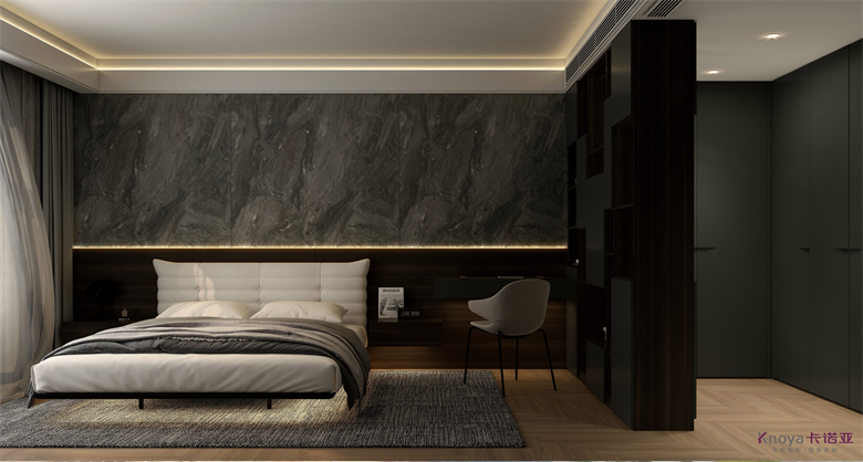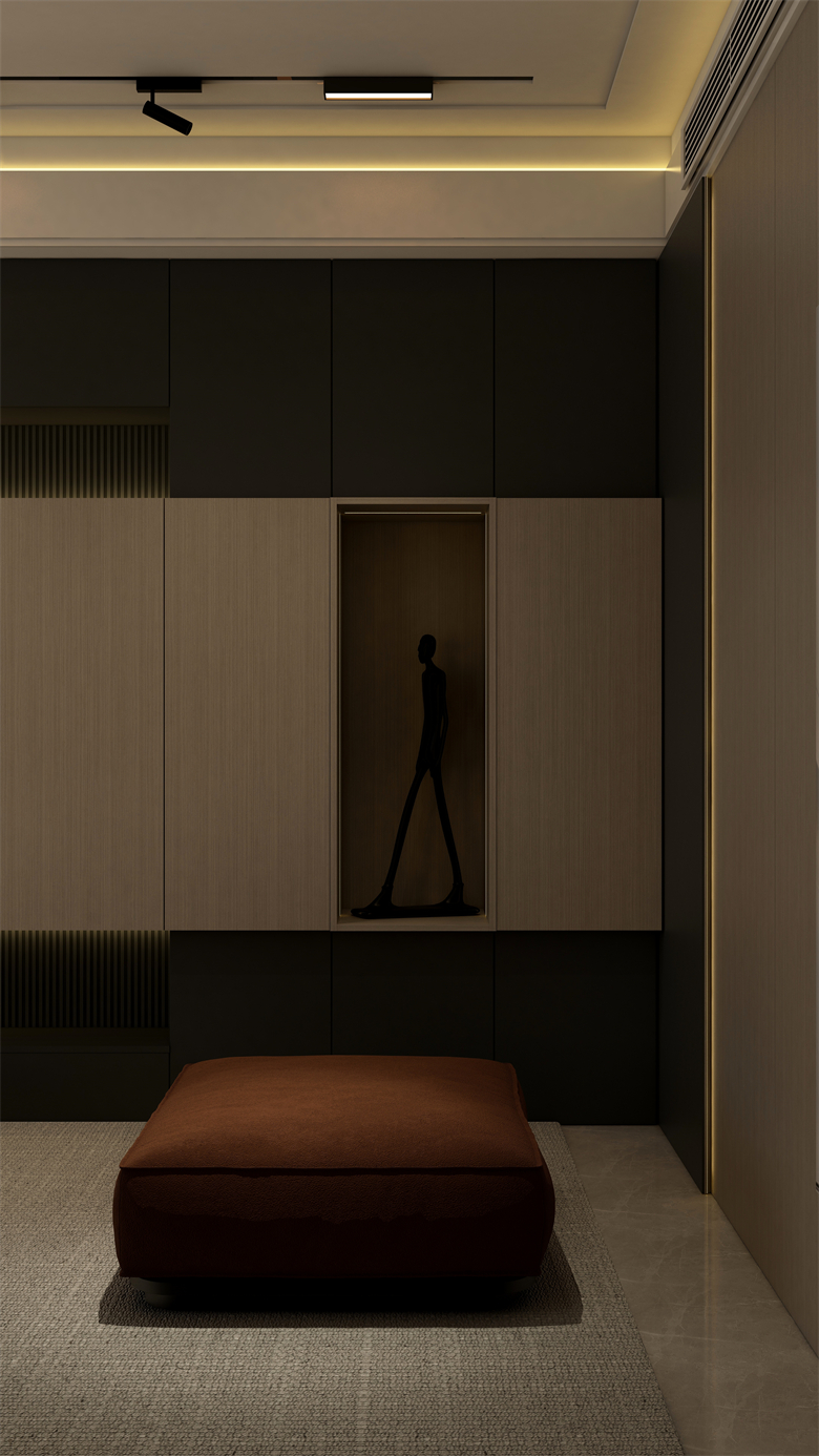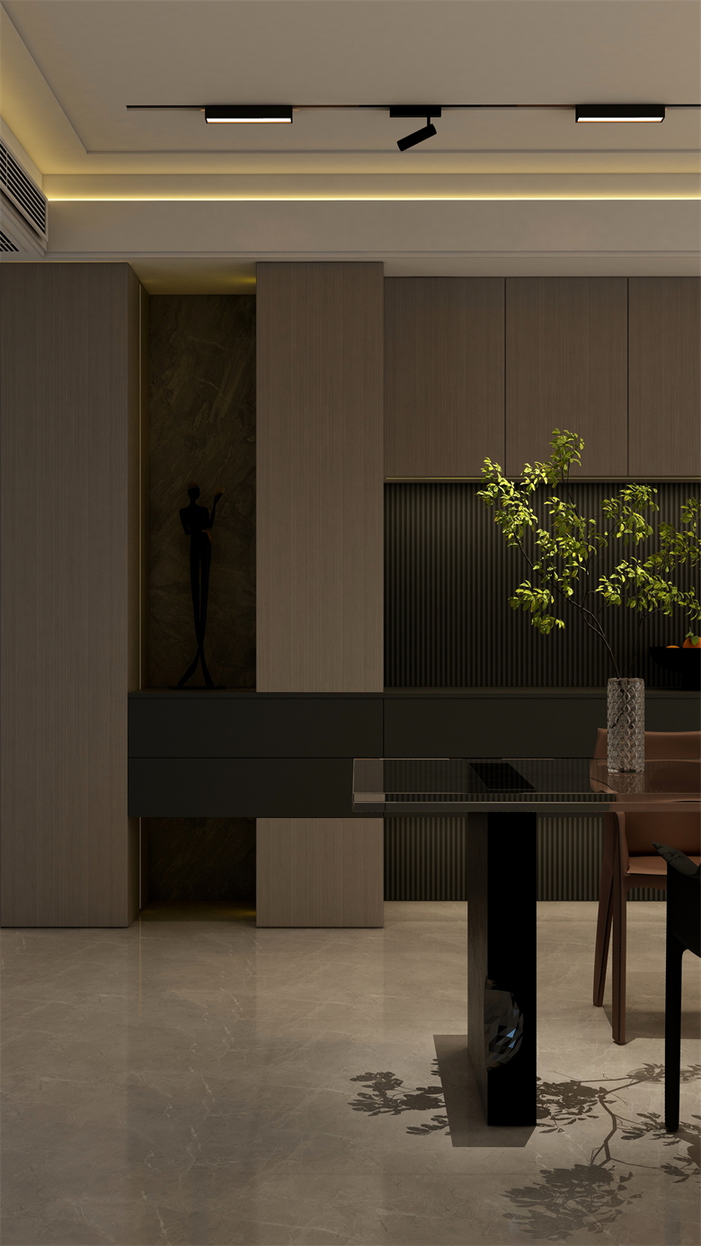 本案設(shè)計(jì)圍繞業(yè)主意式極簡風(fēng)格的需求,主色調(diào)黑、白、灰、咖,多利用金屬色、木色、石材做出變化,點(diǎn)綴少量艷麗色。柜墻門一體化,采用穿插、進(jìn)退等設(shè)計(jì)手法,配合燈光使空間簡潔又頗具設(shè)計(jì)美感。意式極簡風(fēng)格刪繁就簡,遠(yuǎn)離一切浮華和不實(shí)用,從生活本質(zhì)出發(fā),以極簡的設(shè)計(jì)演繹出最本質(zhì)的輕奢美學(xué)。