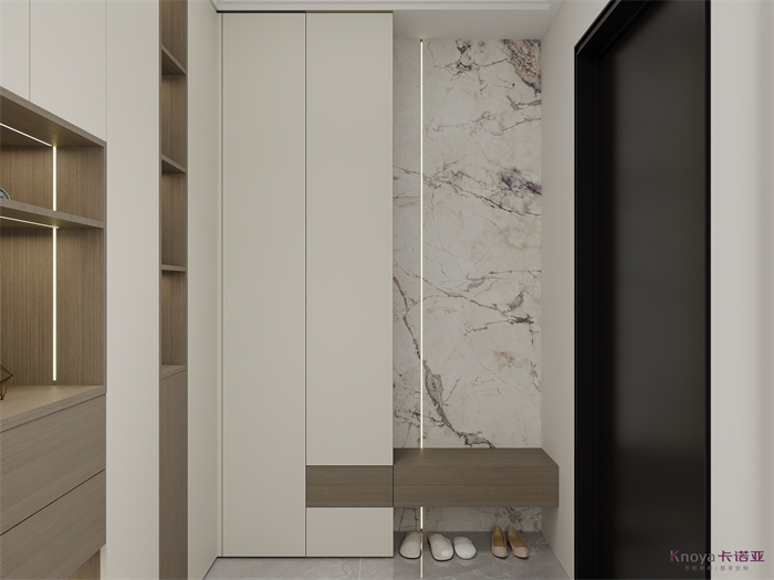 作品簡介:極簡風若是融合以原木風,便會自帶幾分活力、深色木材便更顯低調的奢華,與灰色的大理石地面相配,統一的色調帶來無與倫比的融合感、