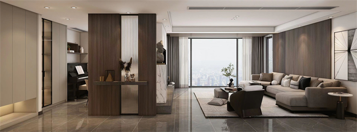 作品簡介:本作原布局是標(biāo)準(zhǔn)小四房,入戶小房間改為交互式客餐廳一體,使得整個(gè)空間更加開放通透。出發(fā)點(diǎn)為表現(xiàn)出整個(gè)空間的連貫性和交互性。全案使用了色塊面積較大的“棕絲木”。木紋細(xì)膩舒暢,結(jié)合卡諾亞專屬專利扣線,無膠安裝,海棠角完美細(xì)節(jié)呈現(xiàn)。整體深色木紋系作為主線,純色塊漆面材質(zhì)作為點(diǎn)綴,小比例藝術(shù)玻璃等;各材質(zhì)協(xié)調(diào)使用。