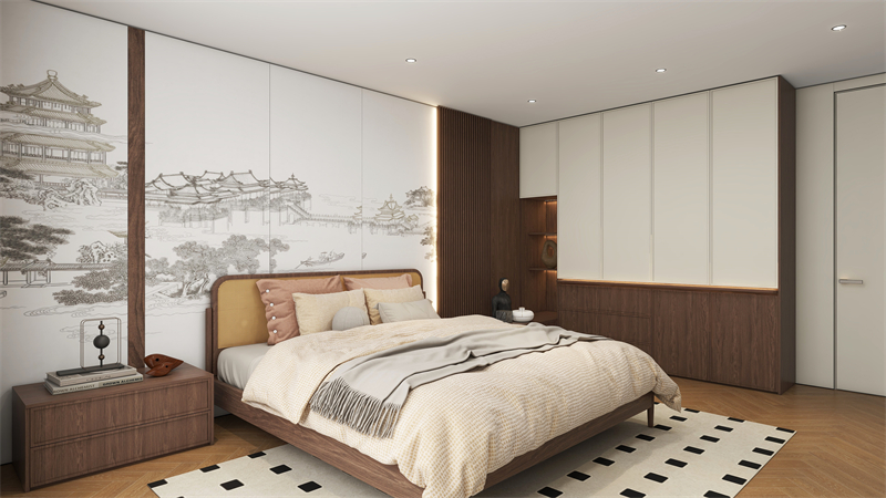 床頭背景墻清秋胡桃護墻板與藤編元素彼此呼應,立體質感的格柵板加持,將中古風的復古與雅致演繹得恰如其分。