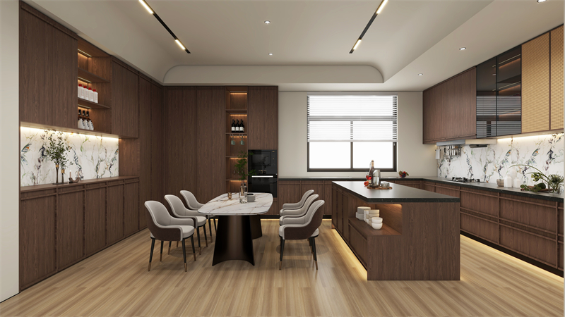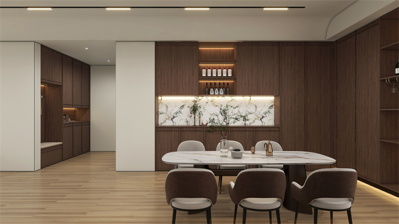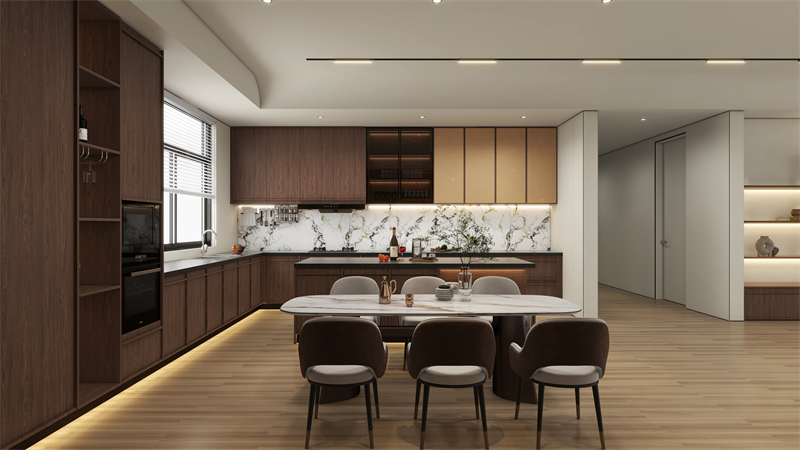 餐邊柜和櫥柜一體化設計,石紋背板嵌入,更顯高級感,同色同奢定制,弱化了餐廳與廚房過渡的生硬感。