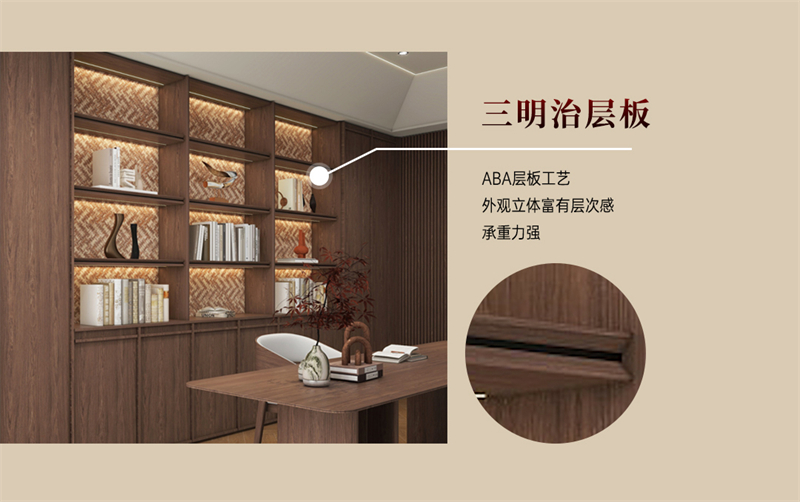 書柜采用三明治層板,外觀立體,富有視覺層次感且承重力強。木紋擁有歲月和自然的痕跡,為空間增添懷舊感,讓書房散發獨特的氣質。