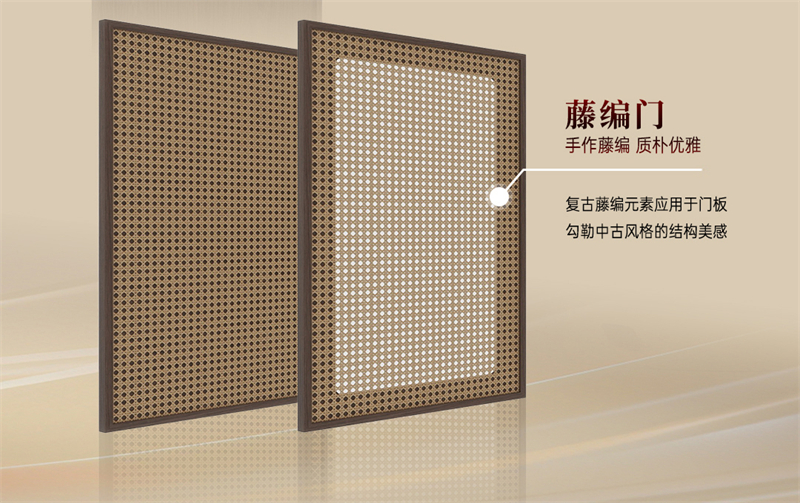 吊柜采用手作藤編柜門,質樸優雅,勾勒中古風格的結構美感,搭配骨骼門島臺,讓空間更有質感和格調。清秋胡桃與藤編元素彼此呼應,將中古風的懷舊與精致展現得恰到好處。