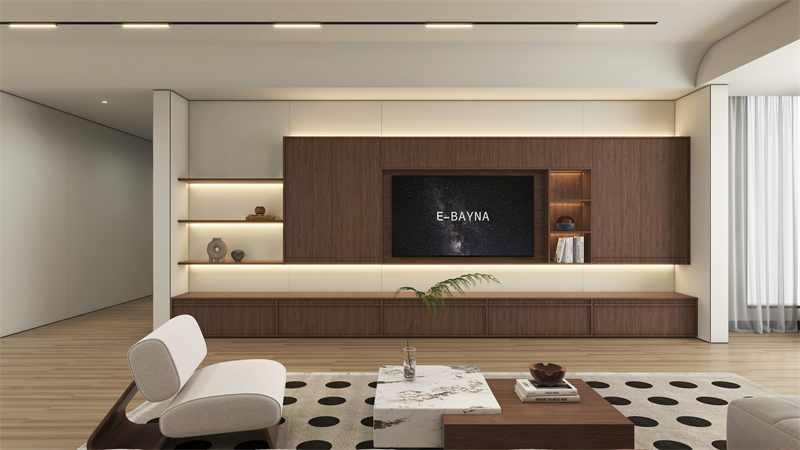 滿墻電視柜+懸空設計,將收納做到隱形的同時,也展現出了中古風的輕盈溫馨,復古色胡桃木的加入,讓中古氣息越發濃郁。