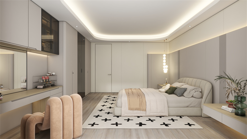 打破傳統(tǒng)墻面直線條的常規(guī)設(shè)計,圓弧護墻板以更柔和的曲線語言,勾勒臥室的柔美與靜謐,搭配奶油色系軟裝,簡單耐看,營造深度睡眠的舒適環(huán)境。