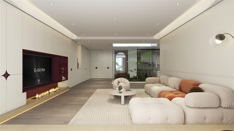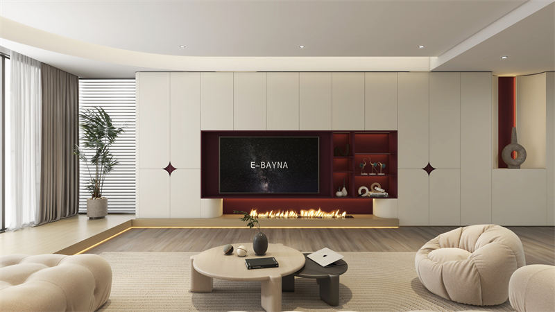 懸空電視柜撞色設(shè)計,搭配弧狀拼接護墻板,保留奶油風溫馨基調(diào)又增添幾分和諧且富有層次感的視覺效果,讓空間輕盈靈動。