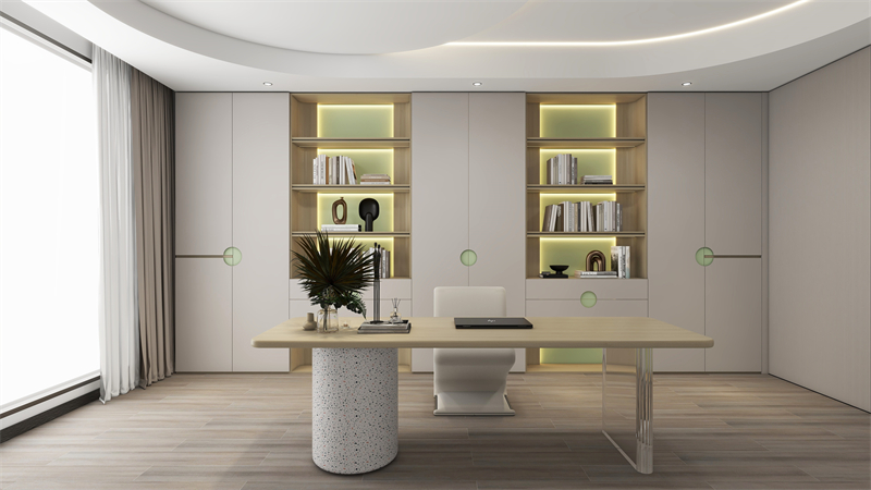 書房以溫馨的白色調(diào)為主,增添濃郁的溫暖氛圍,讓人沉浸于書香墨韻之中。綠意盎然的“夏檸”作為點綴色,清新脫俗的配色,宛如春風拂面,帶來生機勃發(fā)感,讓工作學習輕松愉悅。