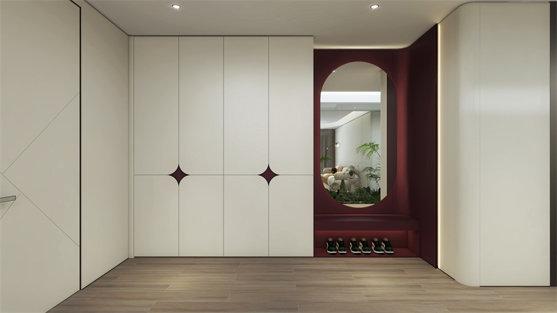 圓弧形的轉(zhuǎn)折處理,使得玄關(guān)區(qū)域在視覺上更加流暢與連貫,宛如自然延伸出的一個優(yōu)雅弧度,引領(lǐng)家人順暢步入家中。下方保留開放式常換鞋區(qū),簡潔實用;圓弧拼接門型搭配“白芷”、“紅鸞”撞色點綴,打破傳統(tǒng)色彩界限,賦予空間柔和而深邃的視覺層次。