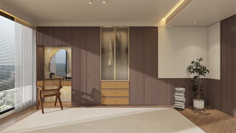 整個空間以深色木紋打底,大面積的木紋拼框柜門,既保留中古經典特色,也兼備古典與現代美感。衣柜局部應用長虹玻璃,嵌入梳妝臺,搭配內嵌燈帶,透光不投影的朦朧感,驚艷每一天。