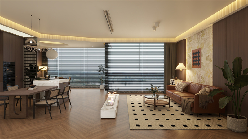 沙發背景墻深色沉穩的“棕憶木”,展現出經典的復古基調,樹葉造型的3D打印畫加持,給空間注入靈動的自然之美,勾勒出屬于家的復古電影藝術感。