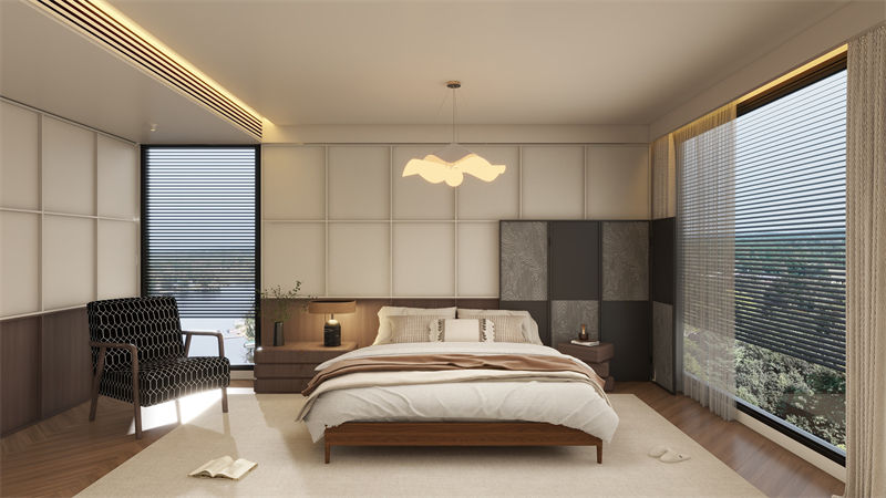 溫潤柔和的臥室空間,捕捉記憶與情感的詩意,陳述著過去與未來的情愫。床頭背景墻采用凹凸有致、細膩流暢的骨骼線與拼色護墻板,讓空間呈現多維立體的藝術美。落地窗讓陽光灑進來,整個空間都亮了起來,感覺走進了溫暖的夢境。