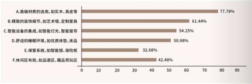 《中國臥室生活方式洞察報告》顯示,臥室生活占據人生至少三分之一的時間,其舒適度和功能性對提升生活質量至關重要,不同人群對于臥室生活的需求是不一樣的。在打造高品質臥室方面,高凈值人群尤其注重高端材質的選用、精致的裝飾細節以及智能化設備的應用。具體來看,77.78%的受訪者認為高端材質不可或缺,61.44%的人認為精致細節同樣重要。