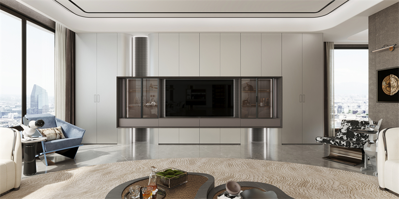 ·材質對話:直紋肌理板材與澀黑柜體形成深淺對比,數碼打印出來的紋理如大理石般通透,鋁木玻璃柜將金屬堅韌與木材溫潤完美結合。
