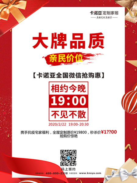 被疫情隔離的潛在裝修需求,有了線上的助力,迅速爆發出巨大潛力。眼下部分企業剛剛開始復工,物流也尚未恢復正常,對于有裝修需求的用戶而言,提前做好裝修規劃,未嘗不是宅家的另一種選擇。因此,卡諾亞采取線上微信搶購、限時優惠等多元銷售模式,并加強與線上消費者的溝通和互動,2月27日還將開啟“卡諾亞定制家居3·15品質直播盛典”。至此,卡諾亞率先掀起的新零售模式,將成為疫情期間家裝銷售的重要渠道。